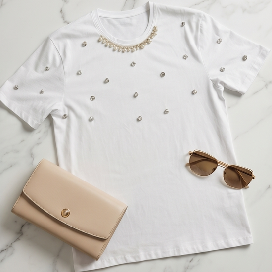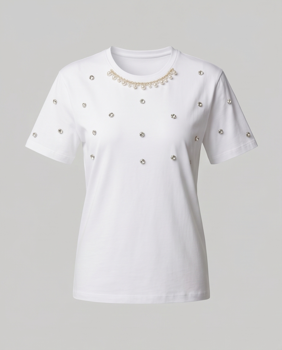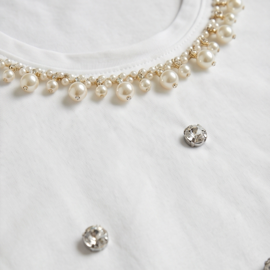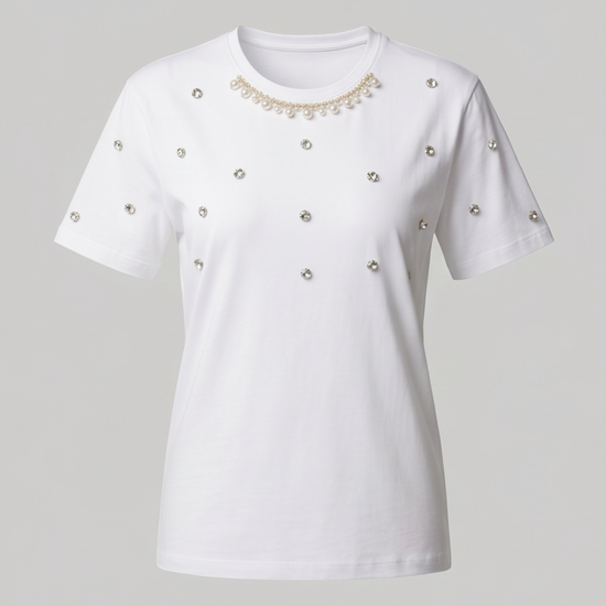Tshirt bianca in cotone organico italiano 100% decorata con strass e perle